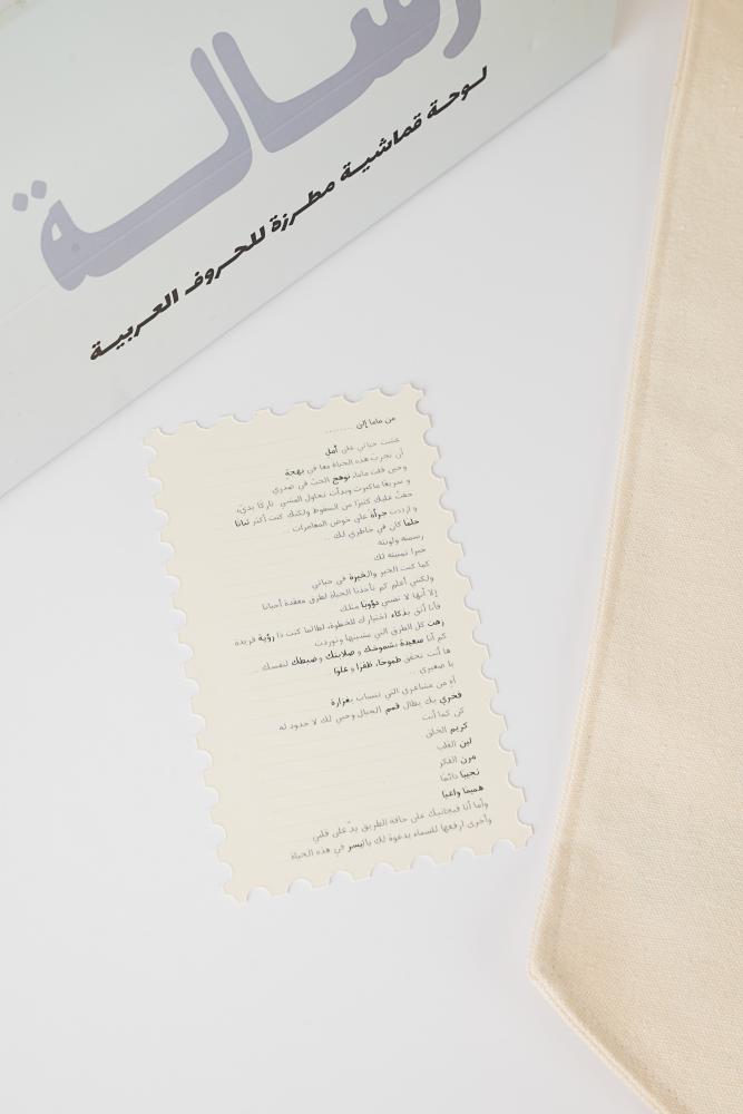 تم تصميم اللوحة بإلهام من التراث العربي الأصيل، حيث تتناغم النقوش المستوحاة من السدو، الجص، القط العسيريوغيرها من الفنون التقليدية، مطرزة بدقة على قماش الكانفس الفاخر بحجم A2، لتخلق تجربة حسية وبصرية مدهشة، تم نسج خط رفيع من المعاني والعمق في حكاية كل حرف.